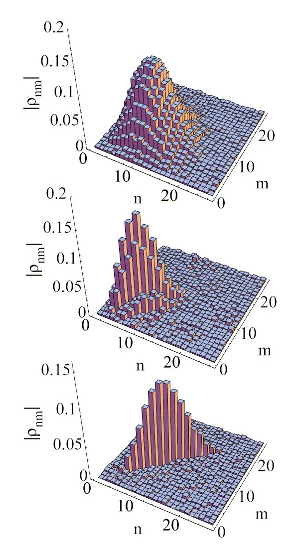 The corresponding density matrices indicate the loss of coherence, i.e. the loss of