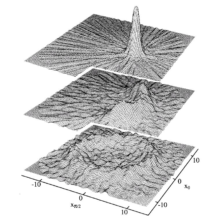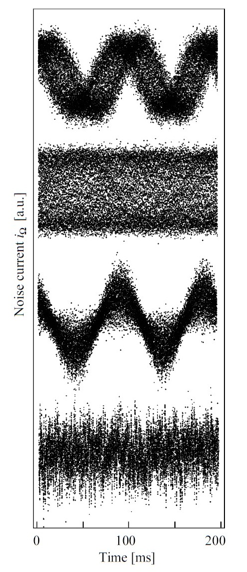 The states presented so far were in theory minimum uncertainty states, thus the product of the two complementary uncertainties of phase- and amplitude-quadrature takes on the minimum value allowed by the Heisenberg relation (we neglect for simplicity for a moment unwanted experimental noise or detection inefficiencies). By externally adding noise to the experimental system, we can generate highly non-minimum-uncertainty states. The following graph shows the result of the addition of phase noise (two cases), amplitude noise or both simultaneously to a coherent state. Experimentally the noise was added electronically or mechanically. My endeavor had been to measure really chaotic light sources preferably the sun light itself, but time didn't suffice...