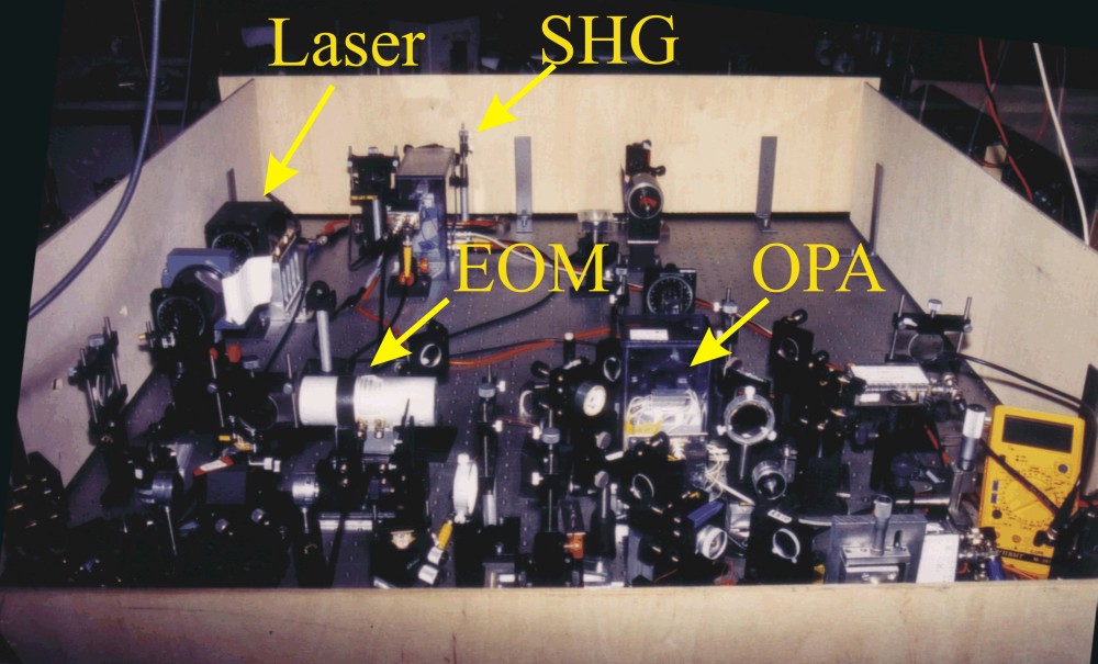 Main part of the actual setup in the laboratory (not seen: The filter cavity and all of the electronics