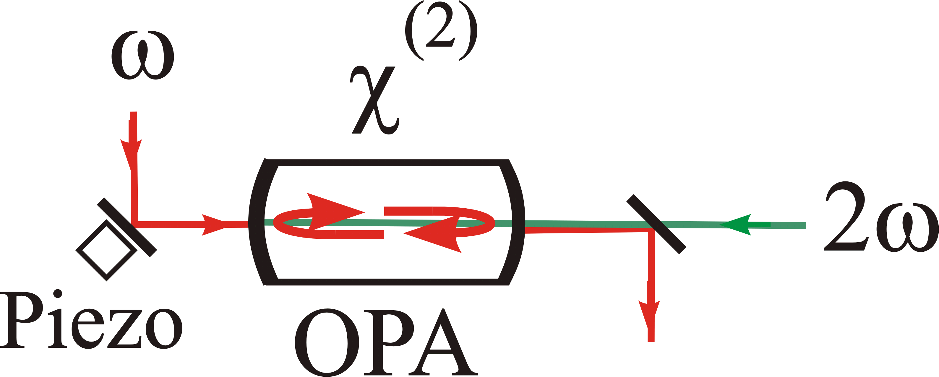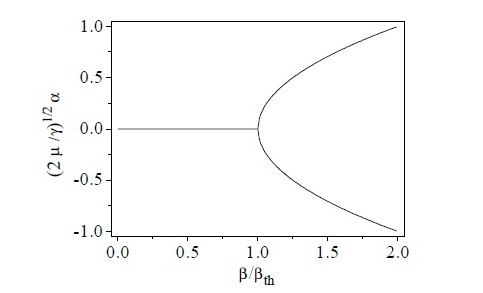 The very exciting theoretical prediction of the OPO behaviour just at its threshold is that it "doesn't know" at which point to begin its oscillation. It has to be in phase with the pump wave, but since the pump wave carries twice the frequency, there is an ambiguity in the phase, where. This ambiguity is called "optical bistability". The plot of the electric field amplitudes of the pump (x-axis) and the output (y-axis) reveals, exactly at threshold the output-field can "decide" to swing upwards or downwards thus exhibiting 180° phase difference. (ref. 25)