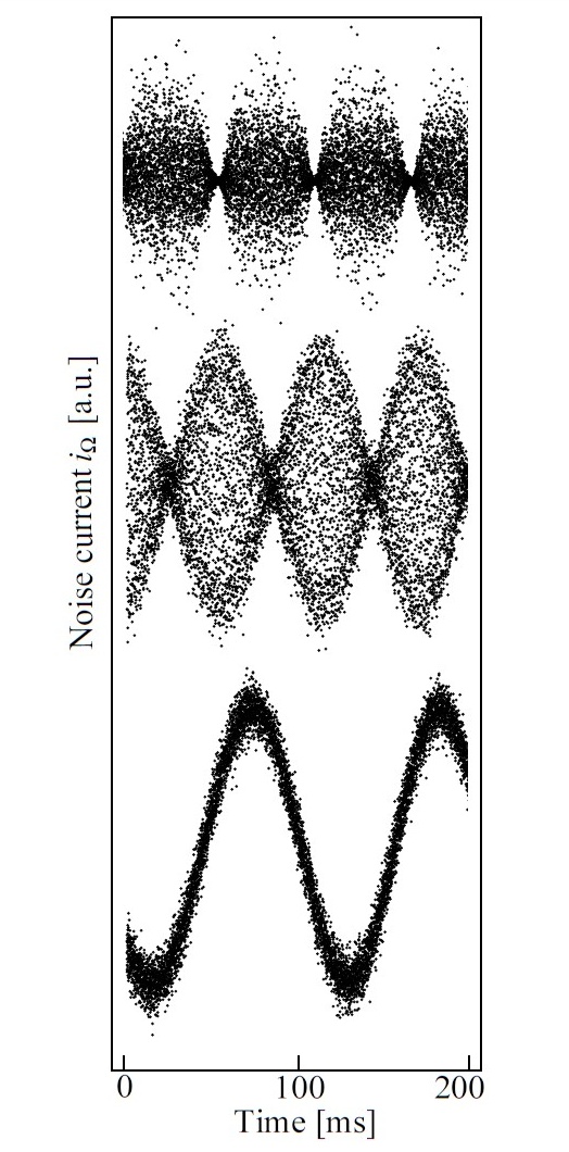 Right: The corresponding measured laser noise at three stages just below, at and above