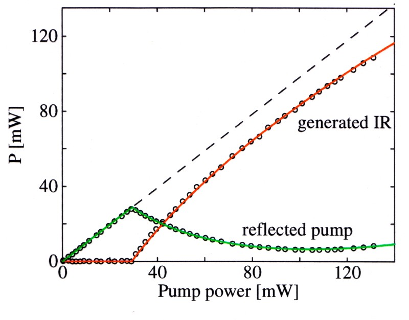 Measured data of the classical OPO-output. When the pump power (green) reaches the threshold of 28 mW the OPO starts to oscillate. Its power increases continually, but its efficiency reaches a maximum at 112 mW (four times the threshold). To my knowledge the 82% efficiency reached are still the world record of continuous wave frequency tunable external cavity optical parametric oscillation. The quantum mechanical measurement regime is below threshold, when there is "no" light emitted in classical theory (just random photon pairs) (ref 21).