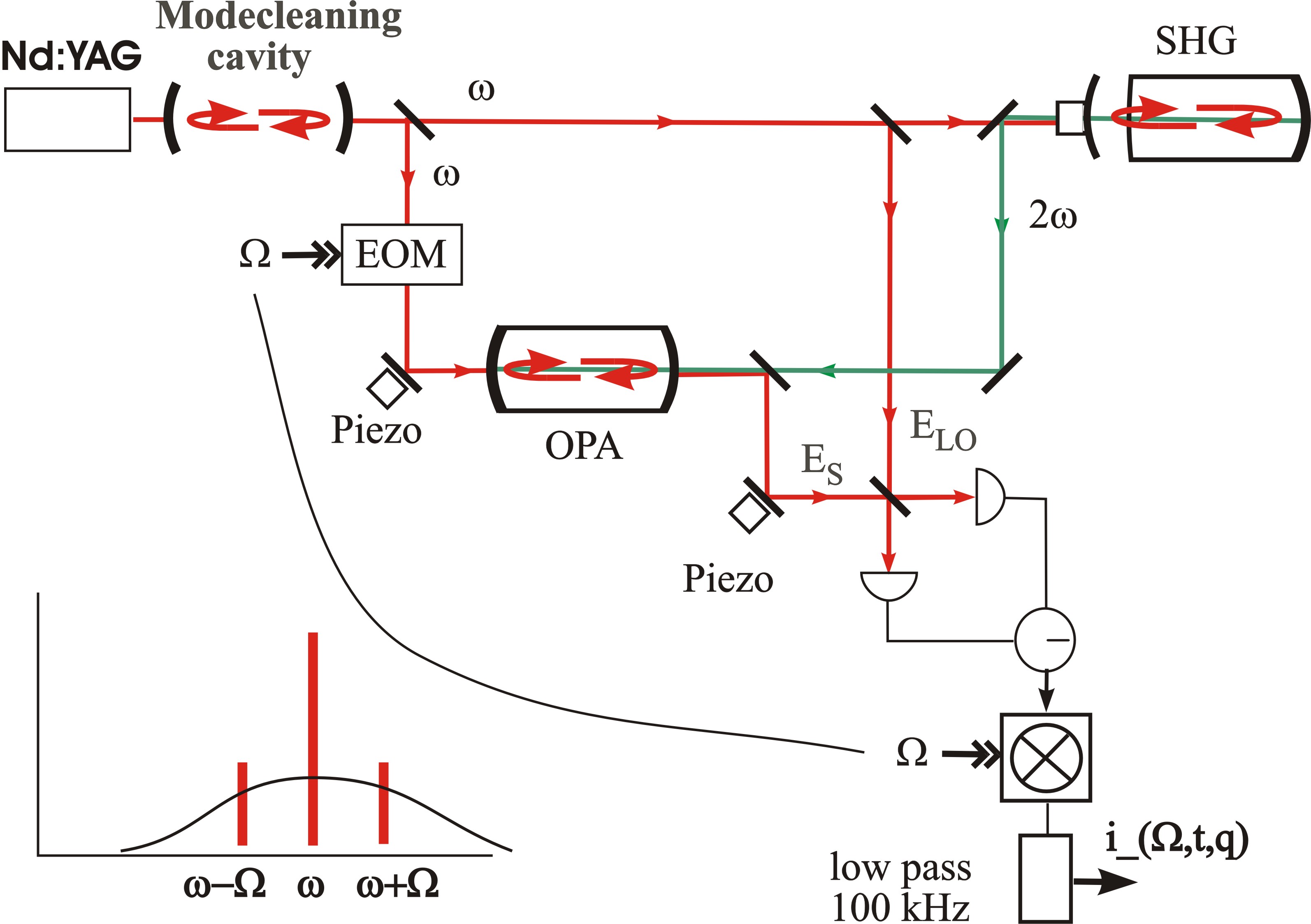 Scheme of the complete setup. The classical noise of the Nd:YAG-Laser is first removed by the modecleaning cavity. Then the main part is frequency doubled in the hemilithic cavity in the upper right corner (SHG, red to green). The signal beam is split off after the mode cleaning cavity and is first electrooptically modulated (EOM) and then injected into the optical parametric amplifier (OPA). The signal is amplified or deamplified depending on the relative phase with the strong green pump beam, with an according change in its quantum noise. The remaining green light is removed and finally the preparated signal beam enters the homodyne detector and is electrically analyzed by a very fast online data evaluation system, part of which is shown in the Java-Animation.