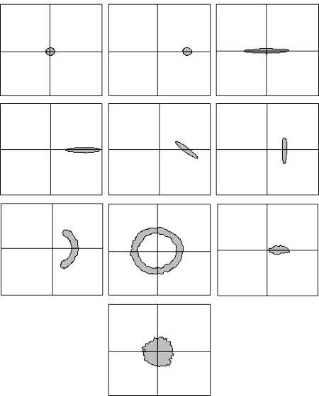 As a summary, all measured states presented in the preceding sections are presented here again, depicted by the contour of their experimentally determined Wigner function in phase space. Shown are a vacuum state, a coherent state, a squeezed vacuum state, three bright squeezed states with different phase angles, two phase-diffused states, an amplitude-diffused state and a thermal state.