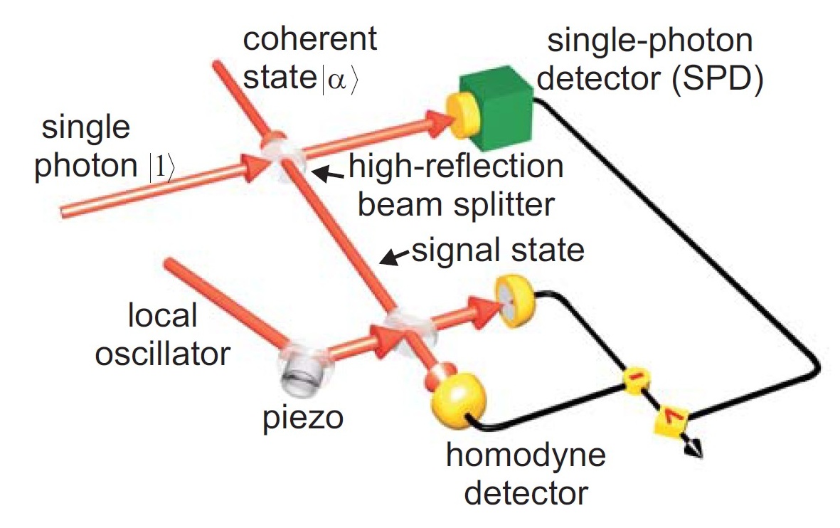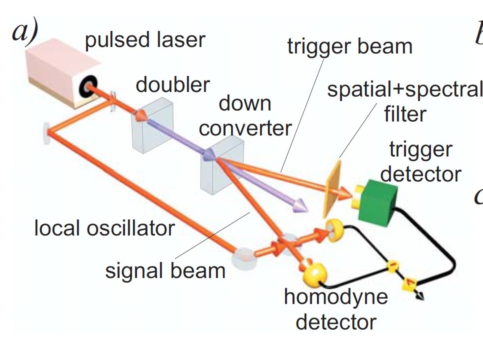 The spectacular one-photon experiments of Alexander Lvovsky et al. (ref. 15) demonstrated outstandingly the power of tomographic detection methods. The Fock state n=1 (one-photon state), as well as the coherent displacement of the one-photon state and its coherent superposition were measured and analyzed. In all three cases parametric downconversion was used, to generate a trigger photon for the homodyne detection scheme (first graph), thus preparing the Fockstate. The coherent displacement then and the superposition were executed with a second beam splitter as shown in the scheme of the experimental setup below (second graph).
