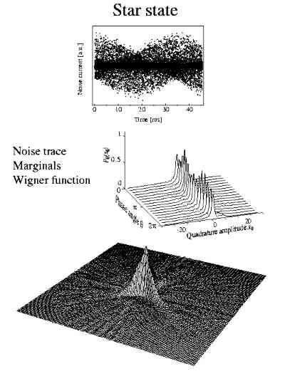 Another example for a state worth a closer examination is the star state, which should evolve during the process of 3-photon downconversion (instead of 2 photons used for the generation of squeezed states shown above). Although frequency tripling is a widely used process, the opposite, splitting one photon of high energy into three has not been observed so far. Perhaps the methods outlined above could provide first insights into this new area of optics. A simulation (T. Felbinger, see ref. 13) of the quantum statistics of the light field yields the following result:
